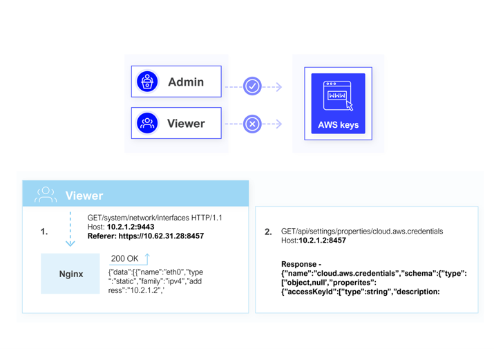 By directly calling an alternate API service on a different port, a viewer user could retrieve AWS access keys, bypassing intended UI restrictions. Such exposure could enable privilege escalation and potential lateral movement within the AWS environment hosting the telecoms 5G core network.