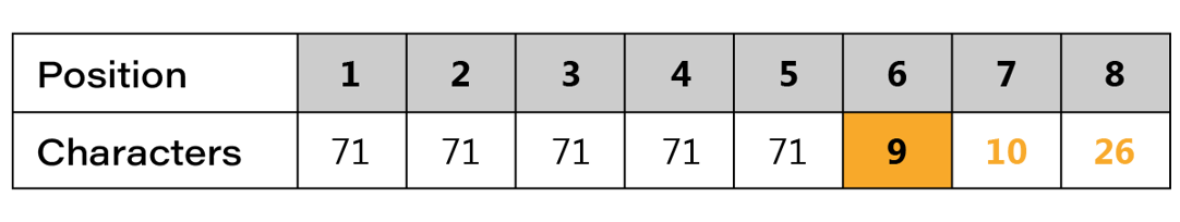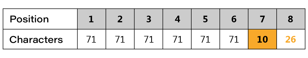 Why is this the case? If there are 71 possible characters, the possible number of characters in each position looks like this: