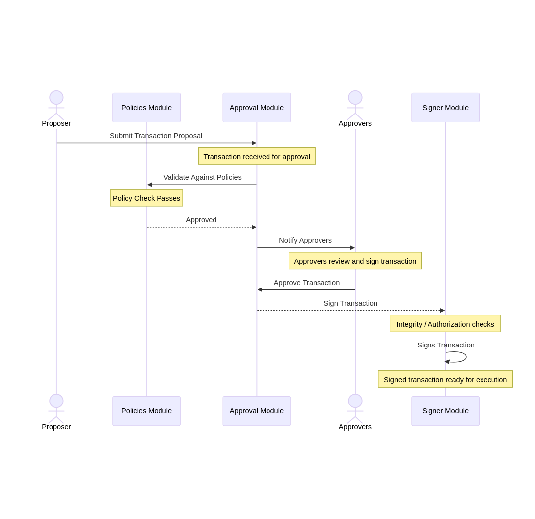 Normally, the bare minimum is to require a threshold or quorum, defining the minimum number of participants required to approve a transaction. For example, 3 out of 5 participants must sign or approve the transaction before it can be executed. This may be enough for small organizations, but usually larger organizations require more complex approvals, involving multiple departments (e.g. Finance, Operations, Security) and also defining the role of Proposer or Initiator, assigned to specific users who are allowed to initiate transactions.