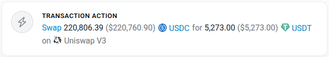 • Swap of 100,000 USDC for 99,587 USDT on UniswapV2 (addresses should also be included, as names are not descriptive enough)