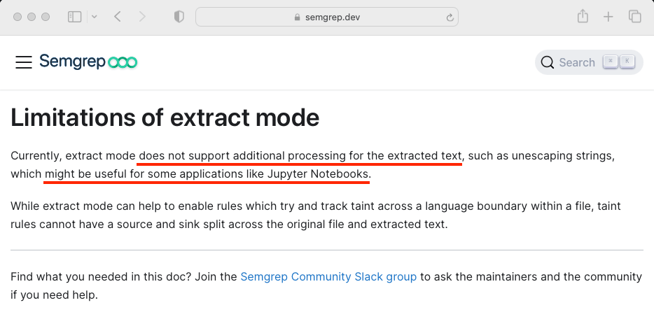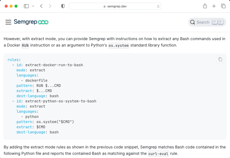 But is there any way to detect them using Semgrep’s built-in features? The answer is “almost”. An experimental feature called “extract mode” (documentation here) was designed for a very similar situation. With the extract mode, you can create a rule to extract specific content from a file format and process it as code for a different language. So, for example, a shell command can be extracted from RUN’s Dockerfile command and processed as shell code instead of Dockerfile.