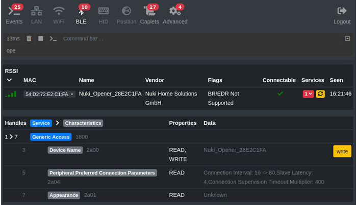 As seen in the image above, the “Device Name” characteristic had write access enabled. As a result, it was possible to send a write command to the device and change its name.