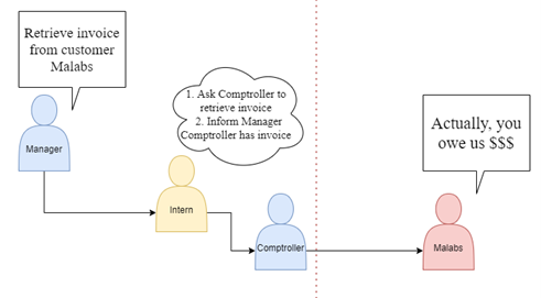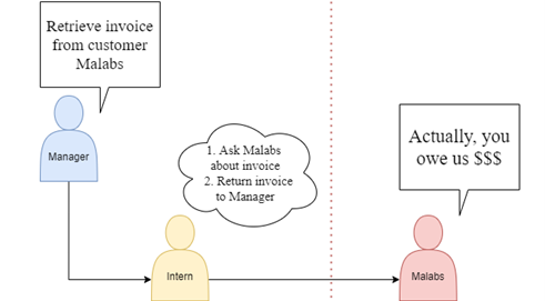 Consider the following example, in which a manager instructs an intern to retrieve a payment from the malicious organization Malabs. The intern has been entrusted with overscoped resources, including access to financial transactions. Malabs manipulates the intern—who cannot distinguish between trusted and untrusted customer data—into embezzling funds from the employer.