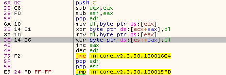 In order to execute the payload, the attackers take advantage of a technique called DLL Search Order Hijacking. Once the malicious DLL is loaded, it will decrypt a part of its own code using a XOR loop (see Figure 4), patch the entry point of the legitimate executable and jump again, back to the malicious DLL (see Figure 5).
