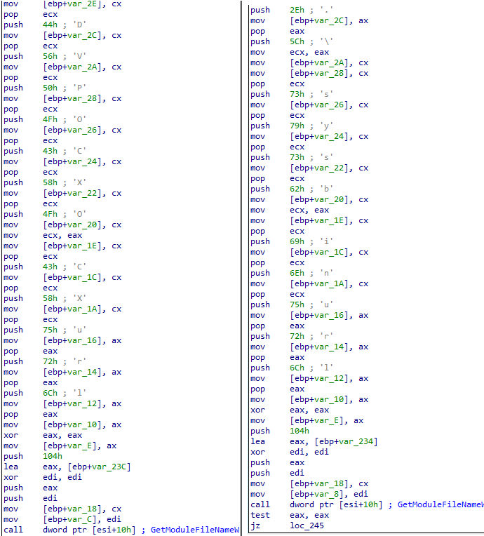 After jumping back to the DLL, it will repeat the same process to decrypt a part of itself and find the addresses of LoadLibrary and GetProcAddress to load all the necessary functions dynamically.