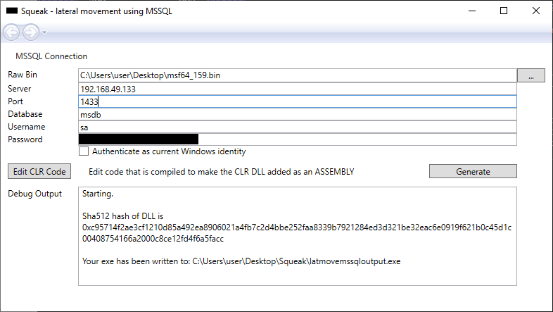 At this point, the SQL Server process is executing any .NET code supplied to it so leveraging this for lateral movement simply requires the construction of an appropriate DLL. As a proof of concept, a simple assembly that XORs some shellcode and injects it into a spawned process was produced. To simplify the creation and invocation of CLR code, GUI application was made that performs the following actions: