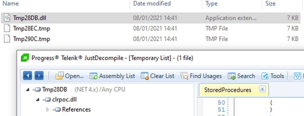 By adjusting file permissions to prevent files being deleted from the C:WindowsTemp directory, it was possible to retrieve a copy of the file before it was deleted by the sqlservr.exe process. This could then be decompiled to reveal the original code: