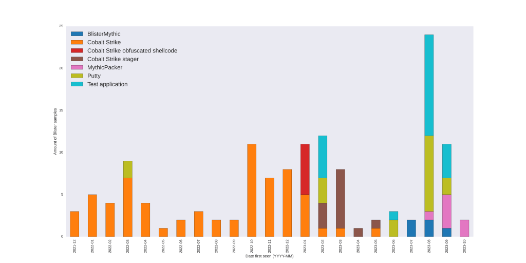 From the analyzed payloads, we see that Cobalt Strike was the favored choice, but that lately this has been replaced by Mythic. Cobalt Strike was mostly dropped as shellcode and briefly run through obfuscated shellcode or a DLL stager. Apart from Cobalt Strike and Mythic, we saw that Blister test samples are uploaded to VirusTotal as well.