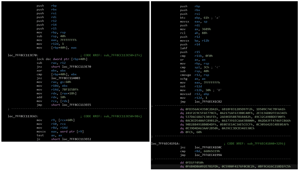 Figure 4, Comparison of two loader components from recent Blister samples, left is without obfuscation and right is with obfuscation.