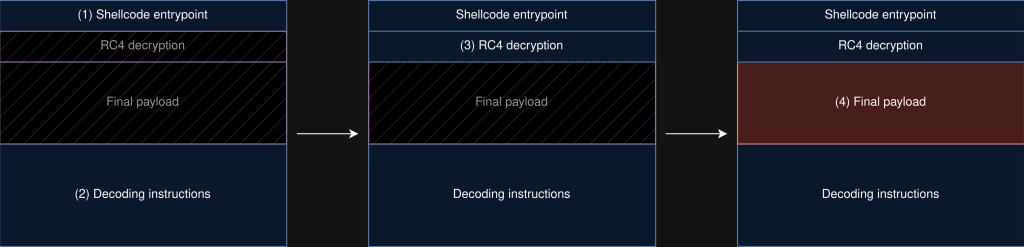 At the end of the decoding stub, it either jumps or calls back and then invokes the decryption function. This decryption function uses RC4, but the S-Box is already initialized, thus no key-scheduling algorithm is implemented. Lastly, it jumps to the final payload.