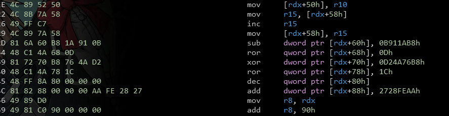 The shellcode is fairly simple, we provide an overview of it in Figure 2. The entrypoint is at the start of the buffer, which calls into the decoding stub. This call instruction automatically pushes the next instruction’s address on the stack, which the decoding stub uses as a starting point to start mutating memory. Figure 3 shows some of these instructions, which are quite distinctive.