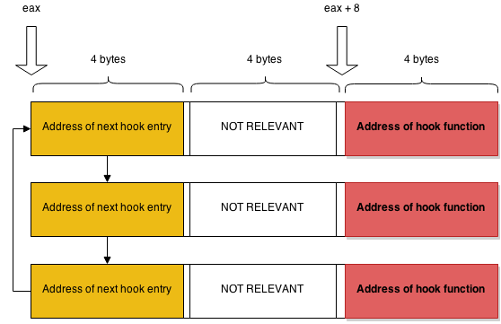 Obviously, the number of registered hooks has to be known to be able to calculate the buffer size. Fortunately, thanks to our reverse engineering effort we already know how to determine how many hooks we have registered.
