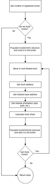 This code then becomes the very core of a tool capable of printing out information about the registered firewall hooks.