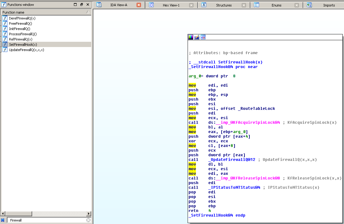 • The first argument (arg_0) of the UpdateFirewallQ function is the address of the firewall hook.