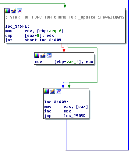 The code above is pretty straightforward, but there is not much interesting in there, except a call to the UpdateFirewallQ function. The UpdateFirewallQ function is more complex. Fortunately we have a graph view, which I find very useful as it makes it easy for example to spot patterns in the execution flow.