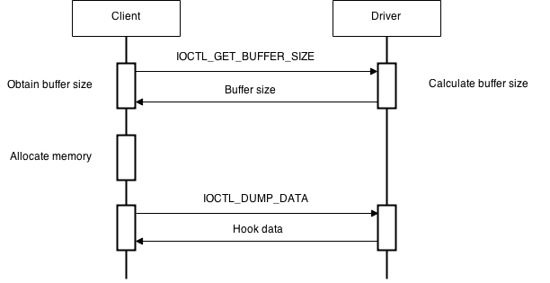First, an IOCTL_GET_BUFFER_SIZE request is sent to the driver. The driver calculates the required buffer size in bytes and returns it to the client.