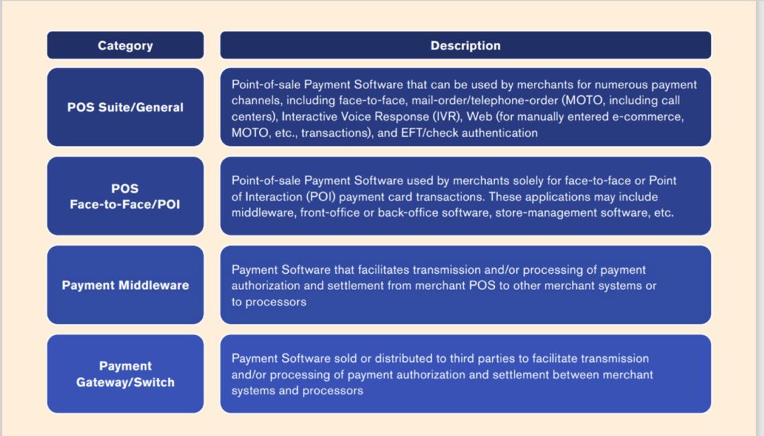 While the Secure Software Program Guide defines 12 unique types of payment applications (which will be a part of the PCI SSC’s listing), the four most common are POS Suite/General, Face-to-face POS/POI, payment middleware, and payment gateway/switch. Under the PA-DSS, these four types make up almost 65% of payment applications acceptable for new deployments.