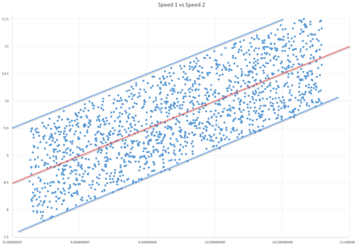 As can be seen, there are well-defined speed limits. Specifically, the speed2 is always lower than the speed1 plus one and higher than speed1 minus 0.8.