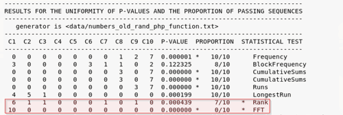 Those tests that have failed (the p-value is lower than the 0.01 significance level or the proportion of sequences passing the test is lower than 0.9) are marked with stars.