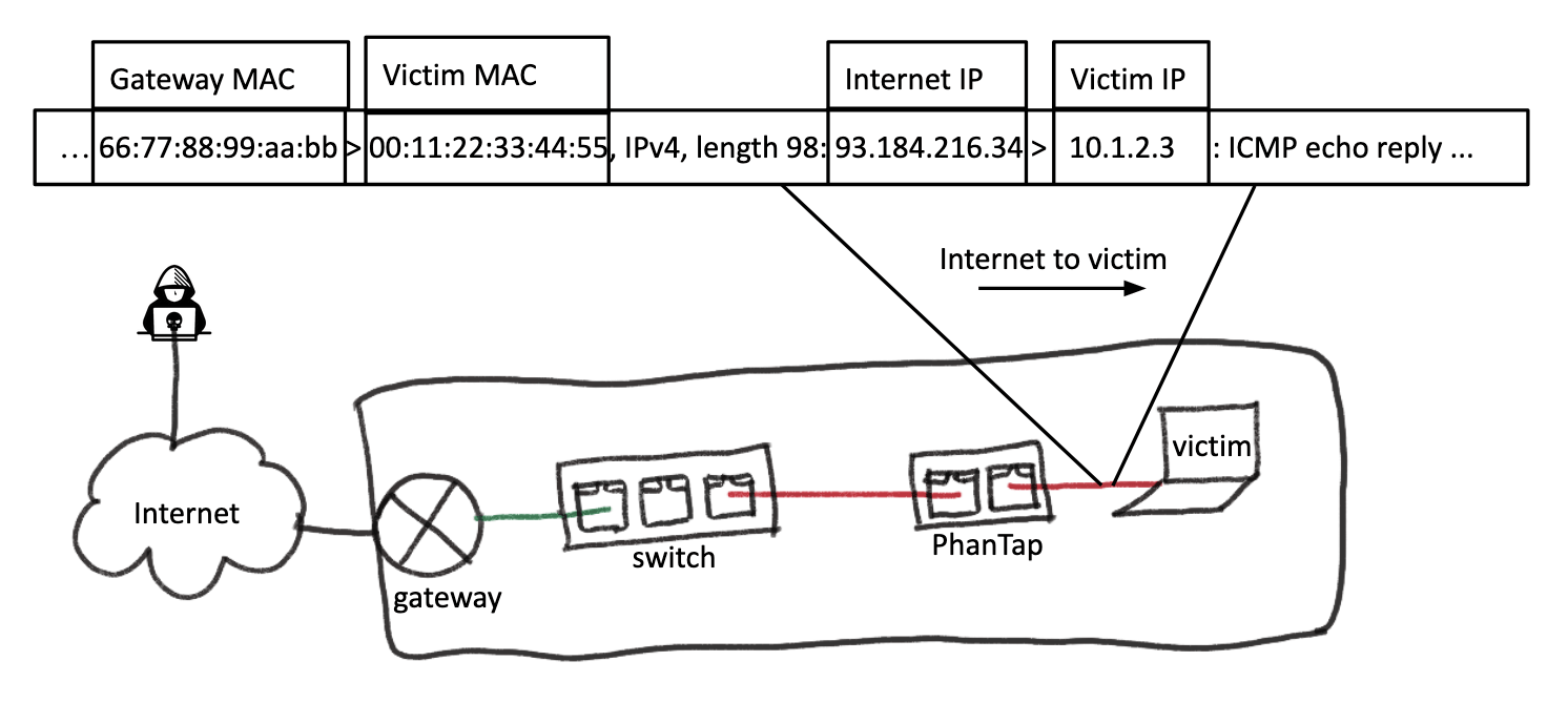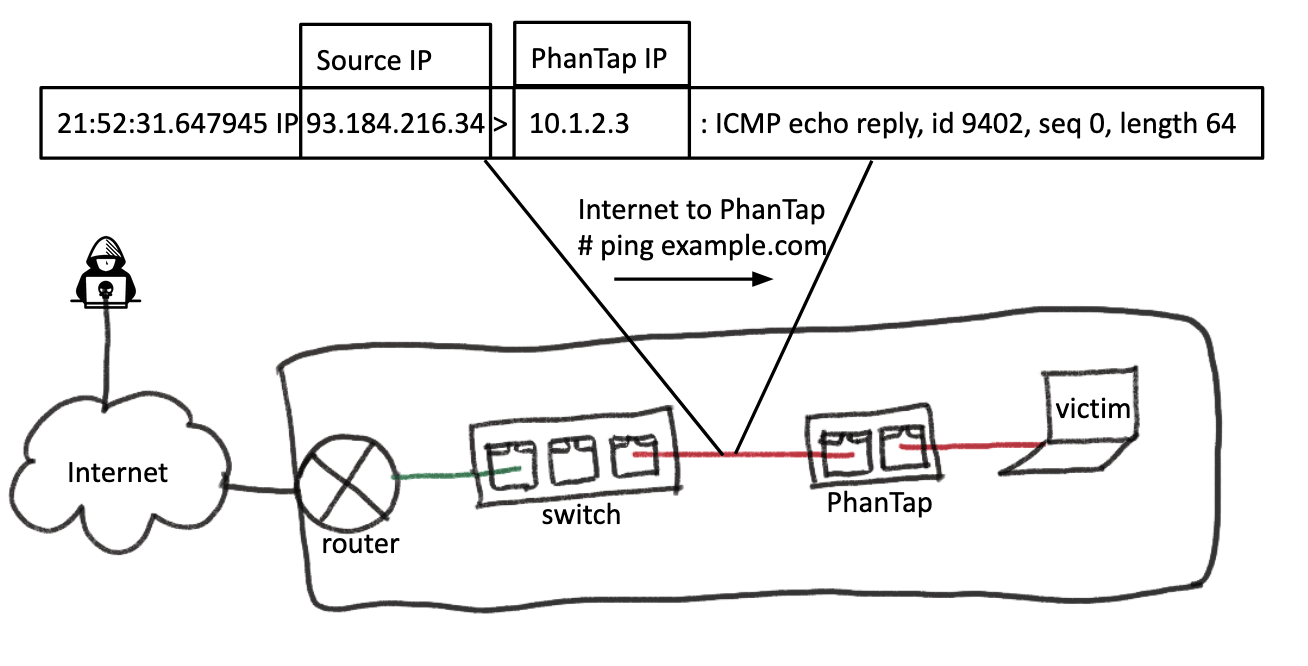 Similar to masking PhanTap’s traffic as the victim for Internet traffic, the device will mask its traffic when talking to the victim as the gateway. This feature can be observed in the following examples of a ping request and response from PhanTap to the victim.