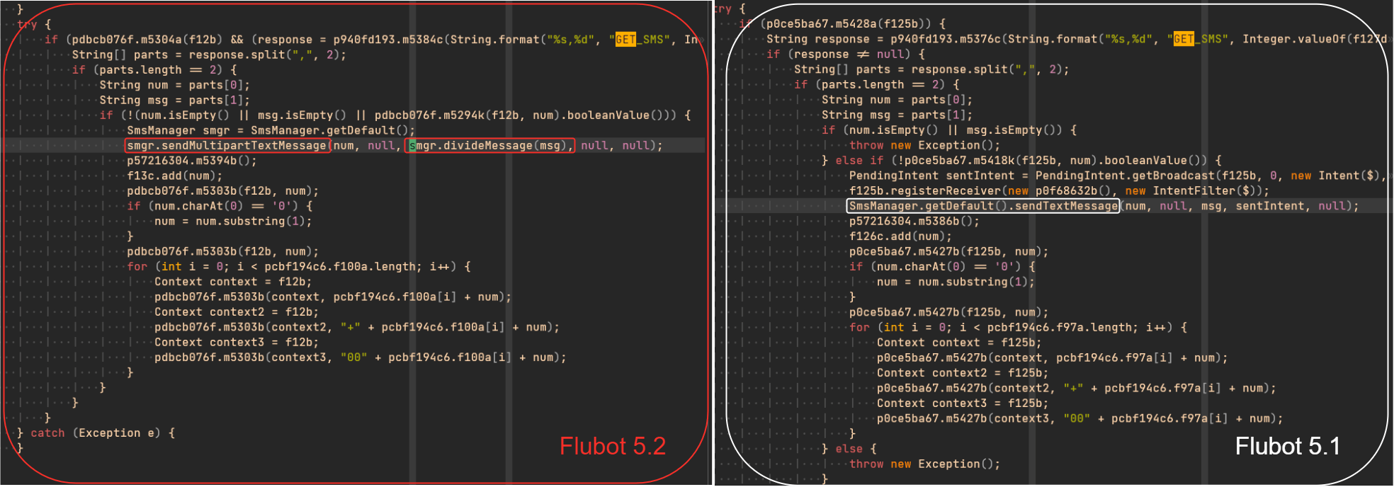 At the very beginning of January new samples for the new version of Flubot were detected. This time, version 5.2 introduced minor changes in which TAs added support for longer text messages on smishing tasks. They stopped using the usual Android’s “sendTextMessage” function and started to use “sendMultipartTextMessage” alongside “divideMessage” instead. This allowed them to use longer messages, split into multiple messages.