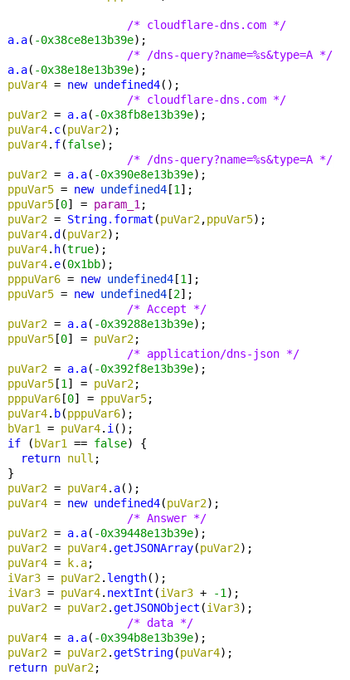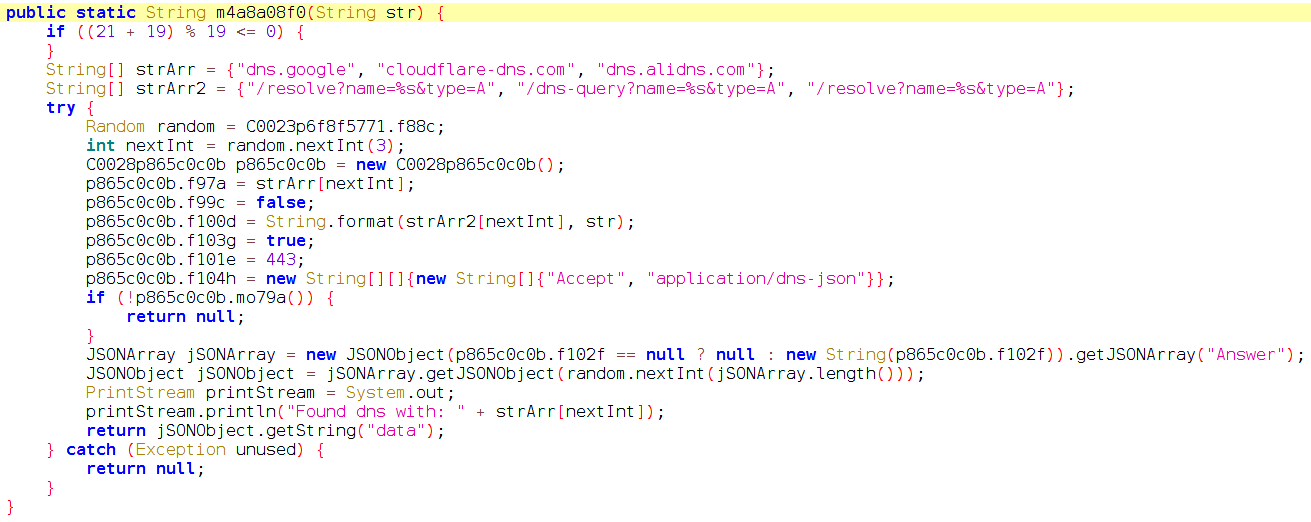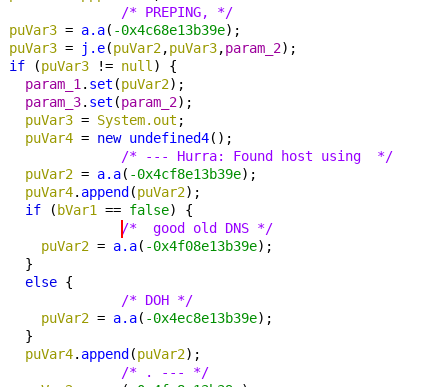 In the following images we show decompiled code of this new version, including the new DoH code. TAs kept the old classic DNS resolving code. TAs introduced code to randomly choose if DoH or classic DNS should be used.