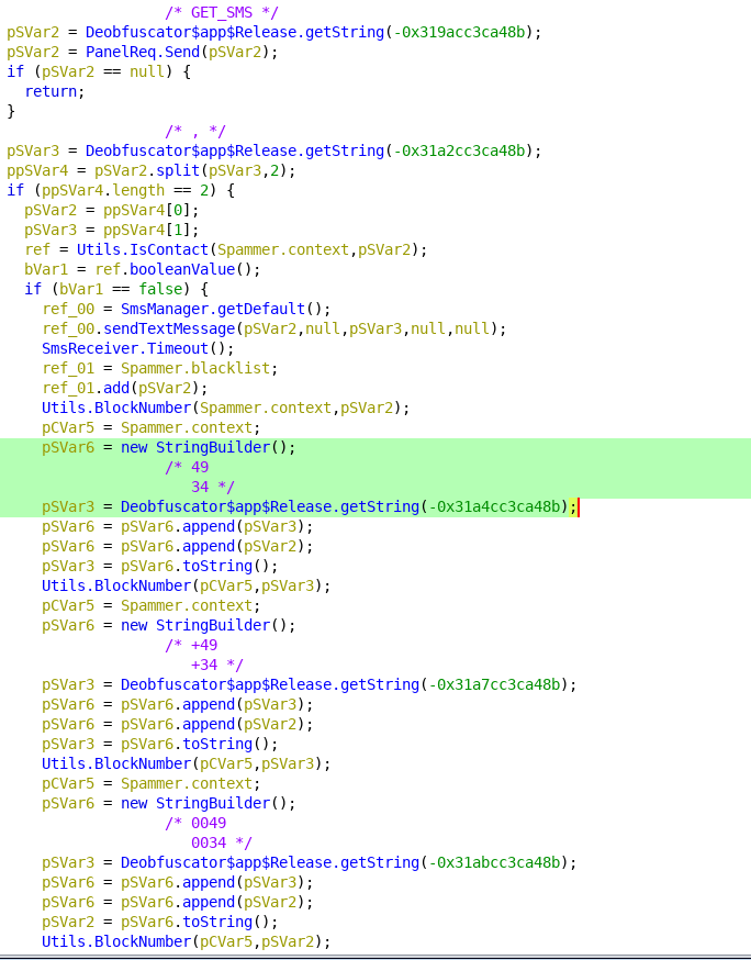 In fact, we can see a new version (3.6) customized for targeting victims in Germany in March 18, 2021. Only five days later, another version was released (3.7), with interesting changes. TAs were trying to use the same sample for campaigns in Spain and Germany, including Spanish and German phone country codes split by newline character to block the phone number to which the infected device is sending smishing messages.