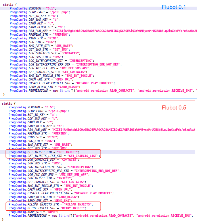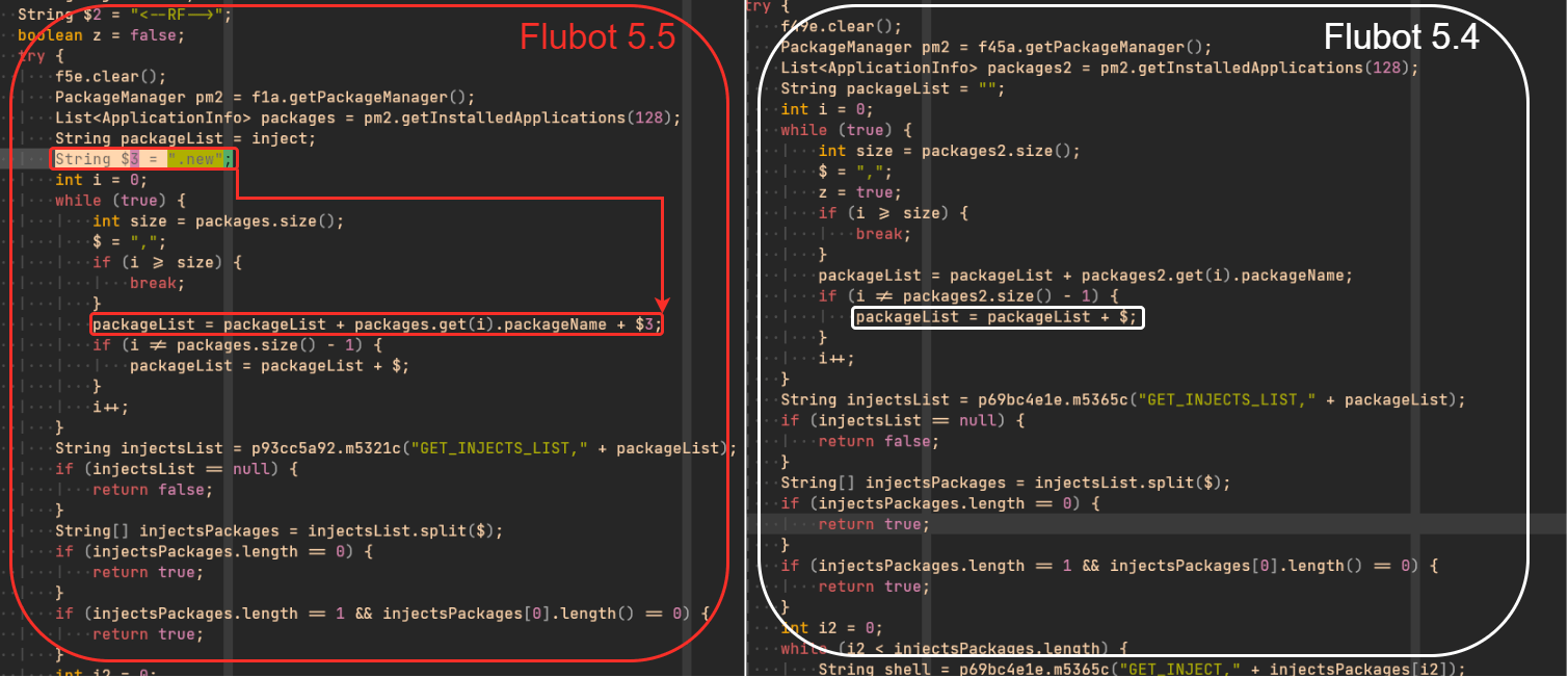 The first thing we realized by looking at the new code was a little change when requesting the list of targeted apps. This request must include the list of installed applications in the infected device. As a result, the C2 server would provide the subset of apps which are targeted. In this new version, “.new” was appended to the package names of installed apps when doing the “GET_INJECTS_LIST” request.