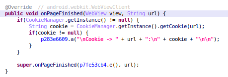 At the beginning, the C2 servers were responding with URLs to fetch the web injections for credentials stealing when using “.new” appended to the package’s name. After some time, C2 servers started to respond with the official URL of the banks and crypto-currency platforms, which seemed strange. After analysis of the code, we realized they also introduced code to steal the cookies from the WebView used to show web injections – in this case, the targeted entity’s website. Clicks and text changes in the different UI elements of the website were also logged and sent to the C2 server, so TAs were not only stealing cookies: they were also able to steal credentials via “keylogging”.
