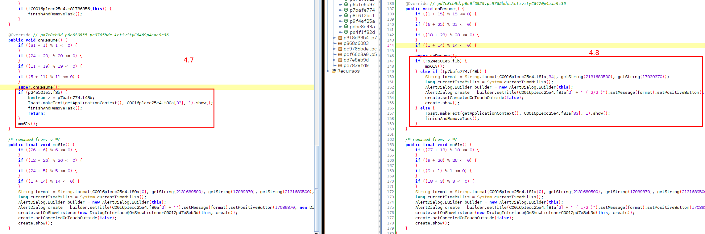 One more time, no major changes in this new version. TAs added support for campaigns in Portugal. As we can see with versions 4.3 and 4.4, it was common for Flubot’s TAs to bump the version number in just a few days, with just minor changes. Some versions were not even found in public repositories (e.g. version 3.3), which suggests that some versions were never used in public or just skipped and TAs just bumped the version. Maybe those “lost versions” lasted just a few hours in the distribution servers and were quickly updated to fix bugs.