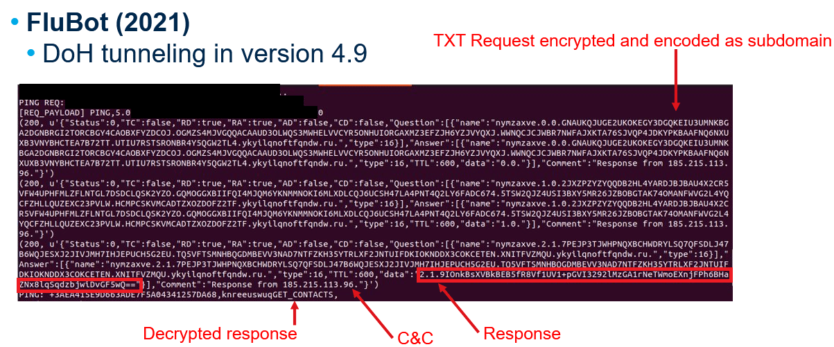 It seems TAs were working since late March on a new version: Flubot 3.9. In this new version, they introduced DNS-over-HTTPs (DoH). This new feature was used to resolve domain names generated by the DGA. This way, it was more difficult to detect infected devices in the network, since security solutions were not able to check