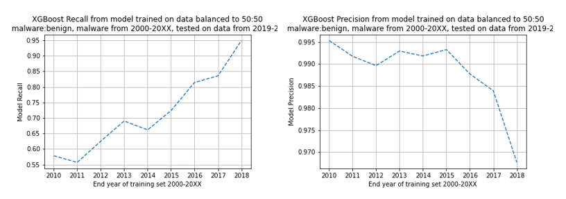 Firstly, note the y-axis on the precision graph – the precision changes nowhere near as much as the recall, where we see around an average of 5% decline in performance per year. The likely reason that the precision changes is the introduction of more malware in the later dated files. What this does unfortunately indicate is that the model will not remain effective for very long; it may need maintaining and updating on new data every year to stay relevant.