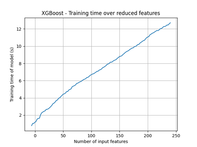 It is visible that the training time using XGBoost decreases in an almost perfectly linear fashion with a reduction of input features. This indicates a strong element of XGBoost’s learning process comes from its looping over input variables, with less time spent looping over fewer inputs. Further investigation here, possibly studying how XGBoost responds to random numbers of inputs and its training time proportionality, is necessary.