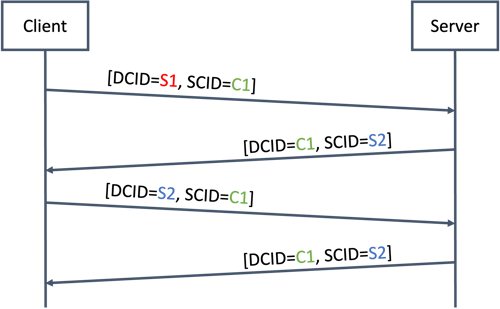 The figure below (similar in spirit to Figure 7 of the RFC) showcases the CID assignment and usage process. In a first step, the client selects a Source Connection ID C1 and sets the Destination Connection ID of the server to S1 (which will be overwritten by the server). After receiving this packet, the server sets the Destination ID to the Source CID of the client (C1), and populates its Source CID with a newly generated value (S2).