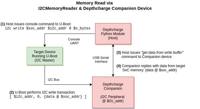 The Depthcharge Companion Firmware provides an I2C peripheral implementation that satisfies the above criteria. It effectively acts as a proxy for data transferred between U-Boot and Depthcharge, by way of our special I2C peripheral.