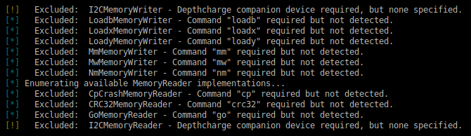 This means that the operation would otherwise be available if we had specified a Depthcharge Companion device. This refers to a simple device running the Depthcharge Companion Firmware, which allows us to extend our vantage point of a platform into communications buses on that target, beyond that of just the UART console.