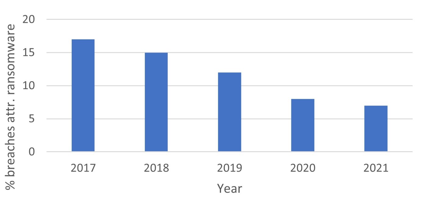 Contradicting the trend is the UK, according to the annual Cyber Security Breaches Surveys the percentage of breaches caused by ransomware attacks across all sectors have been steadily decreasing. However, ransomware remains one of the top three threats to UK businesses and charities. [10] [11] [12] [13] [14]