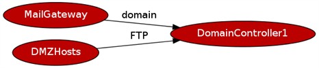 Subgraphs can also be produced on demand – where we may be interested in the allowed connectivity to and from a specific host or entity, we can request this from Visiwall. The example below shows the subgraph of allowed connectivity to and from the ‘DomainController1’ entity: