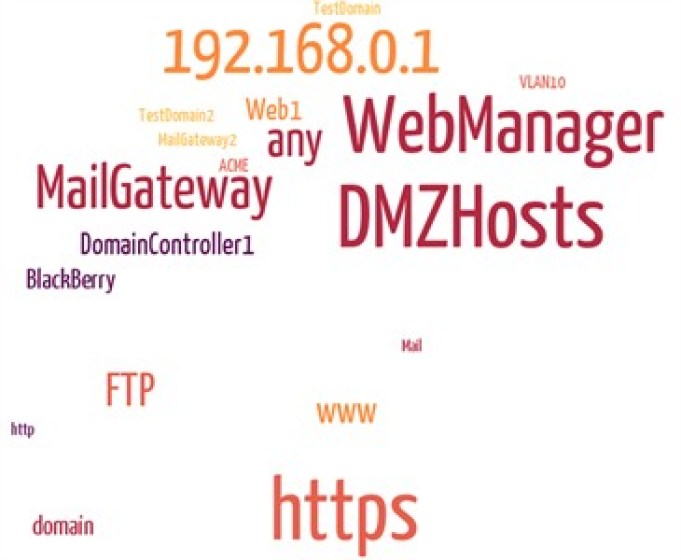 Visiwall also presents a ‘tag cloud’ of the network objects and services in a firewall ruleset. The tag cloud below, drawn from the same ruleset above provides a snapshot of the main hosts and services used within the ruleset. For example, the larger ‘DMZHosts’ object indicates that the object has many incoming and/or outgoing connections (a pivot point), while the larger ‘https’ tag indicates that the https protocol is the main protocol allowed through the firewall: