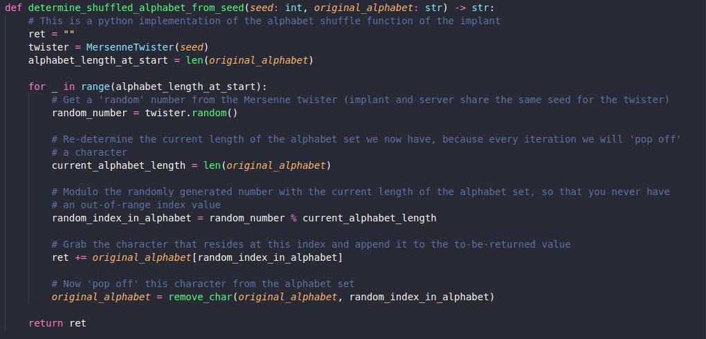 Once this hurdle is taken, the rest of the server-side implementation is trivial. The client appends its current counter value to every DNS query sent to the server. This counter is used as the seed for the PRNG. This PRNG is used to shuffle the initial character set into a new one, which is then used to encode the data that the client sends to the server. Thus, when both server and client use the same seed (the counter variable) to generate random numbers for the shuffling of the character set, they both arrive at the exact same character set. This allows the server and implant to communicate in the same ‘language’. The server then simply substitutes the characters from the shuffled alphabet back into the ‘base’ alphabet to derive what data was sent by the client.