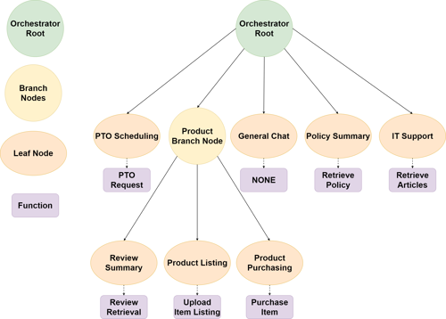 In some instances, it may be helpful to provide intermediary branch nodes that require access to specific data to further assist the user. Branch nodes can access data relevant to and trusted within the context of each individual leaf within its functional domain but may not be trusted to manage leaf nodes that belong to other branches or the root orchestrator. Branch nodes themselves perform the role of micro-orchestrators and determine which leaf most appropriately can manage a user’s request.