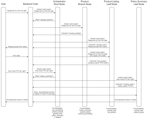 In summary, this approach enables the user to interact with the orchestrator, which reads the content of the user’s request along with a list of recent leaf nodes called during the conversation session. If useful, limited arguments may be provided as well (but not content produced by leaf nodes). The orchestrator determines, based on the content and history, which leaf node is most appropriate to meet the user’s request and delegates the execution to that node. In a sense, this approach is similar to the gatekeeper pattern, but with designated data-facing models for each task the user aims to accomplish, limited to the resources necessary to accomplish that task.
