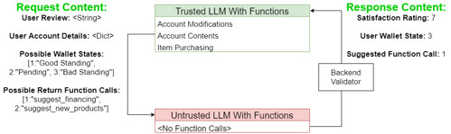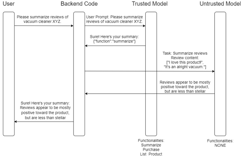 In this example, the user-facing agent is provided the ability to perform function calls that include privileged operations such as account management. A different model instance with no access to privileged operations is called by the backend logic to operate on untrusted data (in this case review summary). The backend merges the output of the two models and provides the final response to the user. By leveraging this gatekeeper architecture, the maximum impact of prompt injection in the content of reviews is limited to an incorrect summary rather than forcing the user to purchase an unwanted product. Of course, in real environments, the complexity of the application codebase will greatly exceed that of this simplified example, but the principle remains the same.