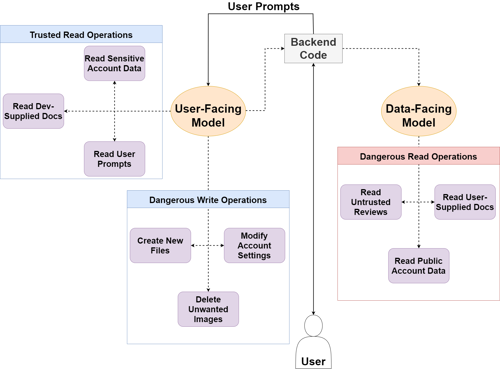 Instead, applications can be architected to “gate” protected functionality when models are exposed to untrusted data. Suppose that in the previous example, the “user-facing model” (which may ingest other forms of trusted inputs instead of user data) calls a summary function (typically by outputting a JSON object with the relevant action and parameters), which is processed by backend code. The backend code can then relay the task to a “data-facing” model with access to no sensitive functions (or in the strongest case, no functions at all). This backend-driven gatekeeper pattern enables the user-facing model to perform useful, functional operations when requested by the user, and tasks the untrusted data-facing model to operate on content supplied by potential attackers without introducing the risk of cross-user prompt injection (also called indirect prompt injection).