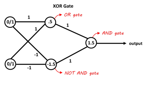 One example used to describe how NNs handle nonlinear data is NN’s use to model a two-input XOR gate. The main reason for choosing the two-input XOR function is that although it is simple, its outputs are not linearly separable [3]. Hence, using an NN with two layers is the best way to represent the two input XOR gate. The following figure (from Abhranil blog [3]) shows how we can use a two-layer neural network to imitate a two-input XOR. The numbers on the lines are the weights, and the number inside the nodes are the thresholds (negative bias) and assuming using a step activation function.