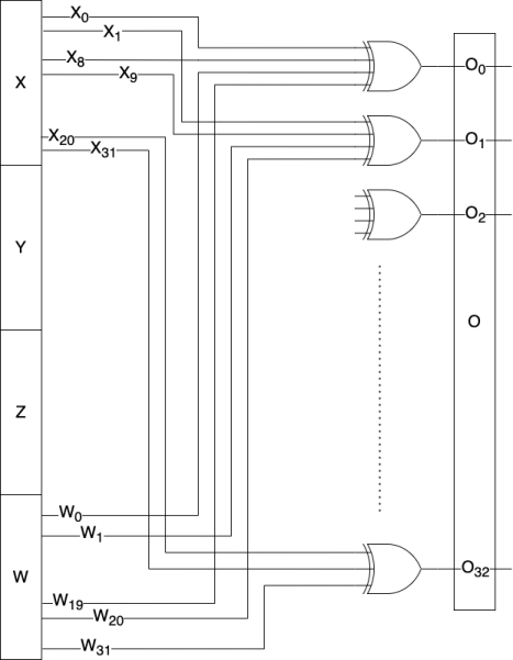 O0 = W0 ^ W19 ^ X0 ^ X8
