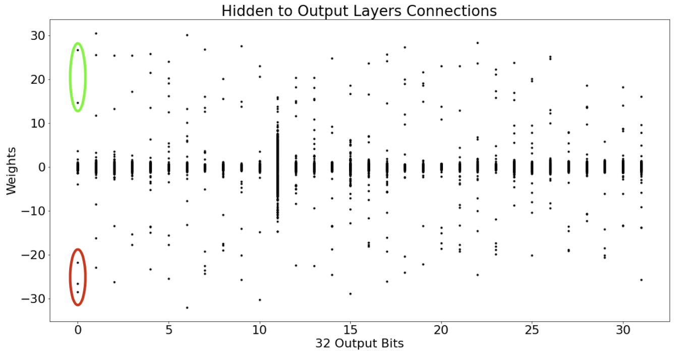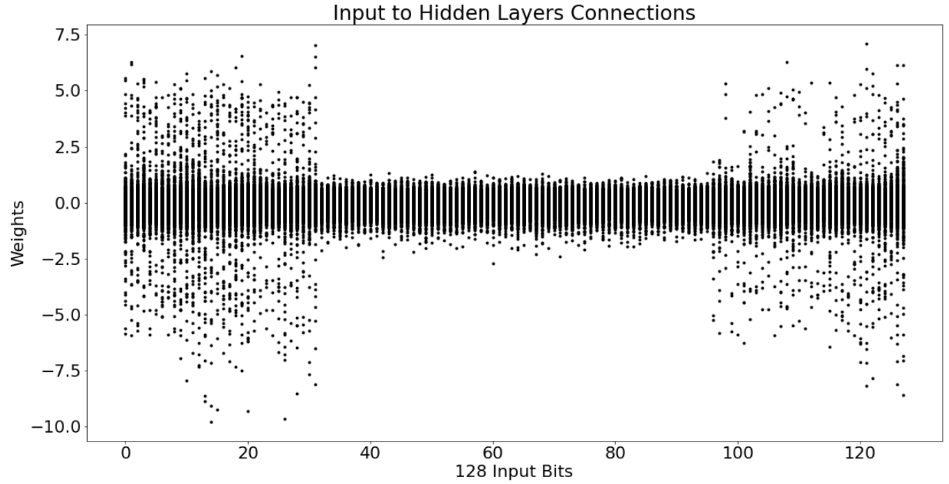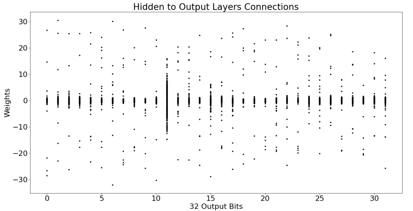 As we can see, very few of the hidden nodes are connected to one of the inputs, where the weight is greater than ~2.5 or less than ~-2.5. The rest of the nodes with low weights between -2 and 2 can be considered not connected. We can also notice that inputs between bit 32 and 95 are not connected to any hidden layers. This is because what we stated earlier that the implementation of xorshift128 PRNG uses only x, bits from 0 to 31, and w, bits from 96 to 127, from the inputs, and the other two inputs, y, and z representing bits from 32 to 95, are not utilized to generate the output, and that is exactly what the model has learned. This implies that the model has learned that pattern accurately from the data given in the training phase.