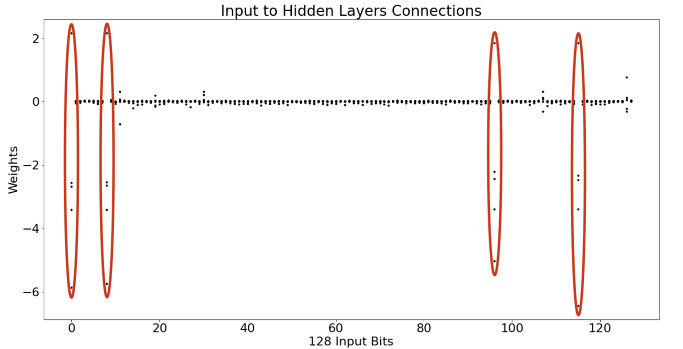 As discussed in section 2, the xorshift128 PRNG uses the last four generated numbers to generate the new random number. More specifically, the implementation of xorshift128 PRNG only uses the first and last numbers of the four, called w and x, to generate the new random number, o. So, we want to check the weights that connect the 128 inputs, the last four generated numbers merged, from the input layer to the hidden layer, the 1024 hidden nodes, of our trained model to see how strong they are connected and hence we can verify which bits are used to generate the outputs. The following figure shows the value of weights on the y-axes connecting each input, in x-axes, to the 1024 hidden nodes in the hidden layer. In other words, each dot on the graph represents the weight from any of the hidden nodes to the input in the x-axes: