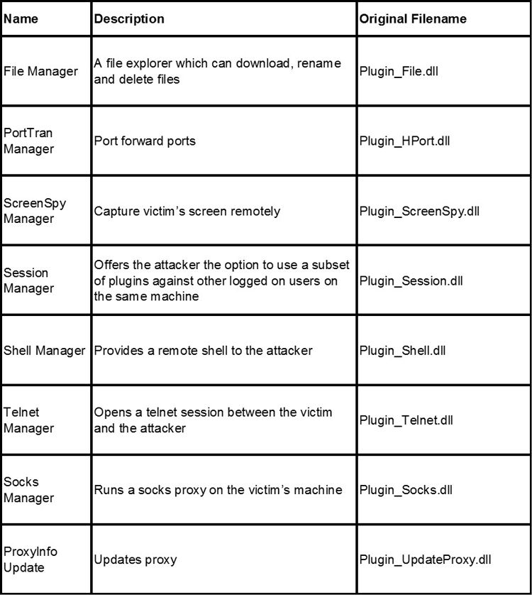 Most of the available plugins are based on the Gh0st RAT source code and a summary of them can be found below: